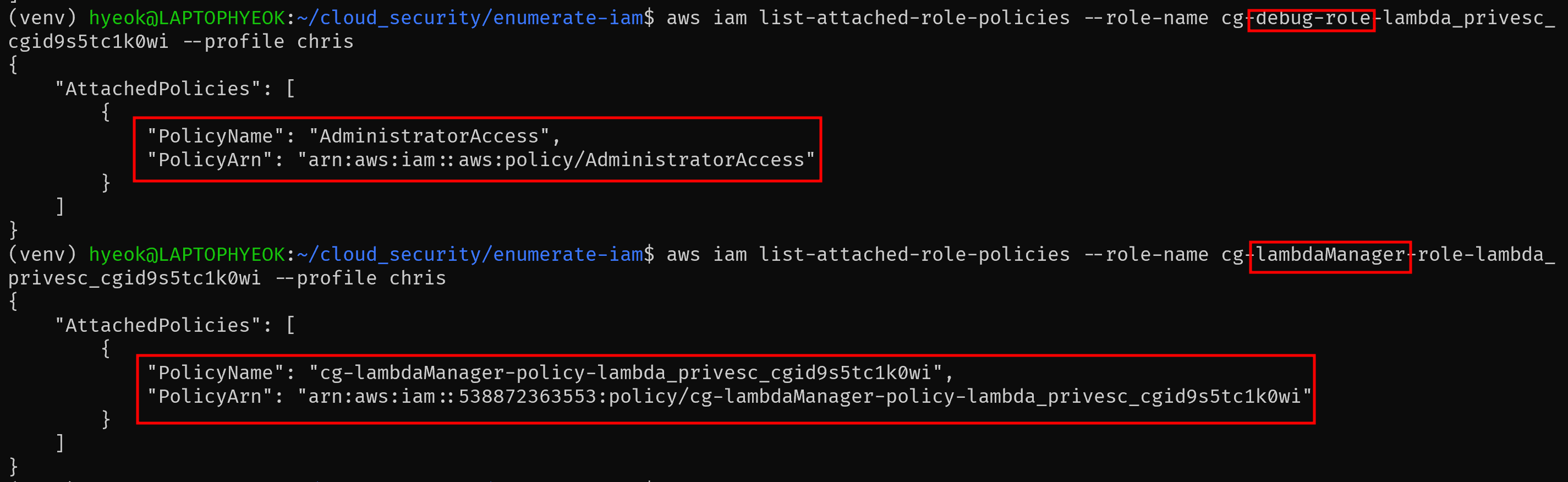 각 Role들을 확인한 결과, chris가 lambdaManager Role을 Assume해, debug Role을 할당한 lambda 함수를 생성하면 AdministratorAccess 권한을 가진 Lambda 함수를 생성하고 실행할 수 있게 되는 것이다.