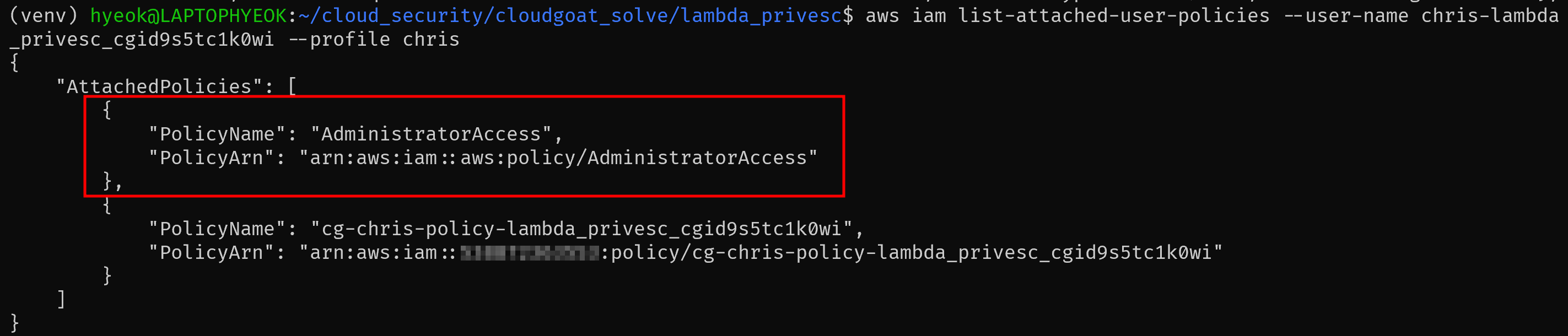 따라서, chris User에 AdministratorAccess Policy를 attach하는 lambda를 생성하고 invoke하면, 최종적으로 chris는 AdministratorAccess 권한을 갖게되는 것이다.
