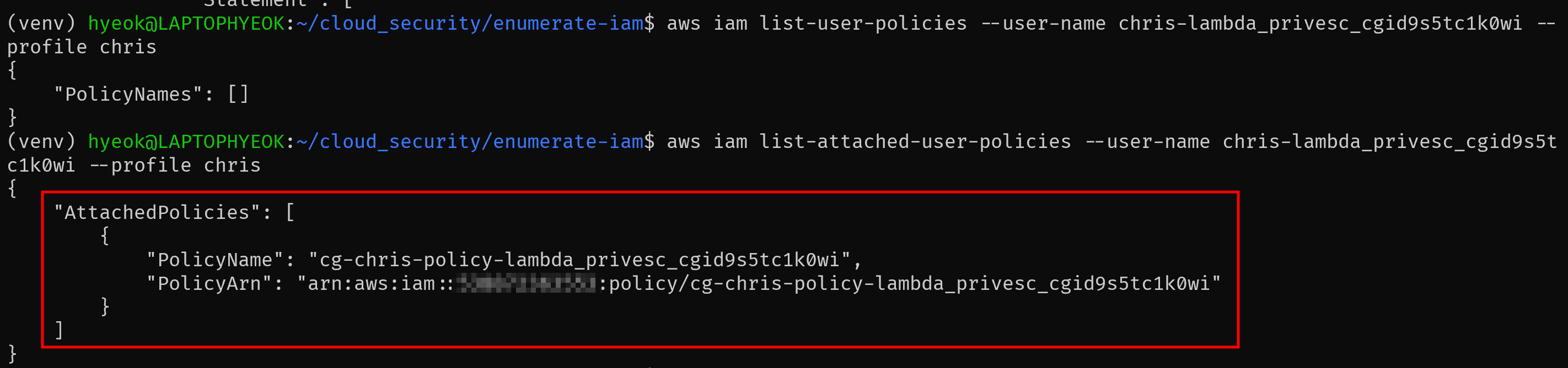 aws iam list-attached-user-policies --user-name [chris User명] --profile chris