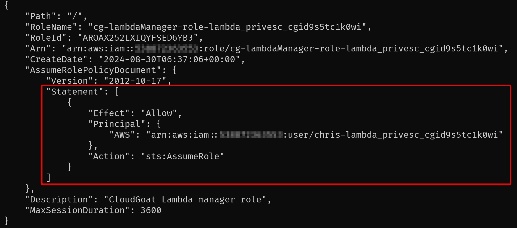 Debug Role은 lambda 서비스에 대해 Assume Role이 가능하도록 제한되어있고, lambdaManager Role은 처음에 부여받은 chris가 Assume할 수 있도록 지정된 것을 확인할 수 있다.